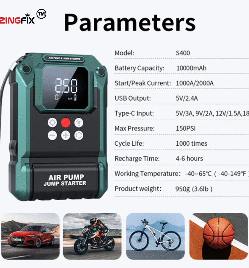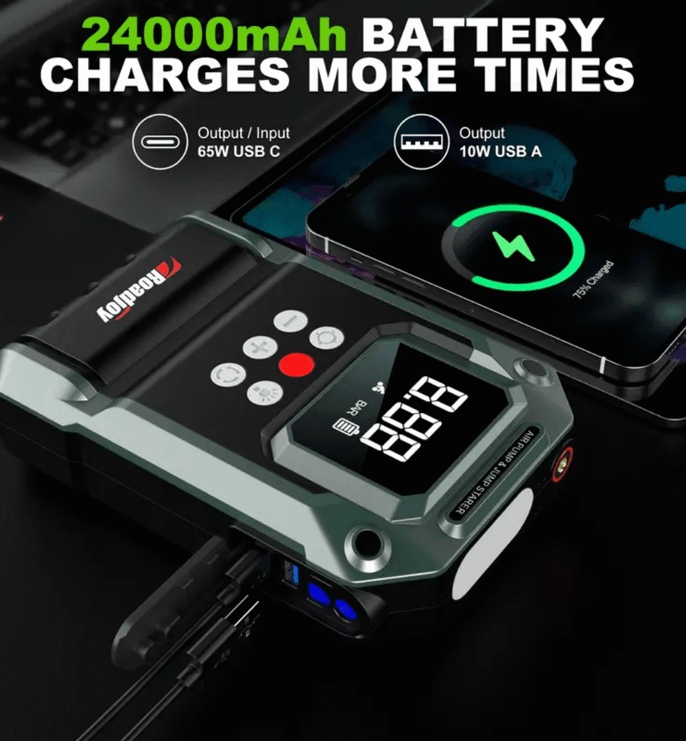 Experience unmatched performance and reliability with this Heavy-Duty 12V Car Jump Starter with Air Compressor — a powerful, all-in-one emergency device built for demanding situations. Equipped with a high-capacity 10000mAh battery, it can instantly jump-start cars, SUVs, and bikes, even in extreme conditions.