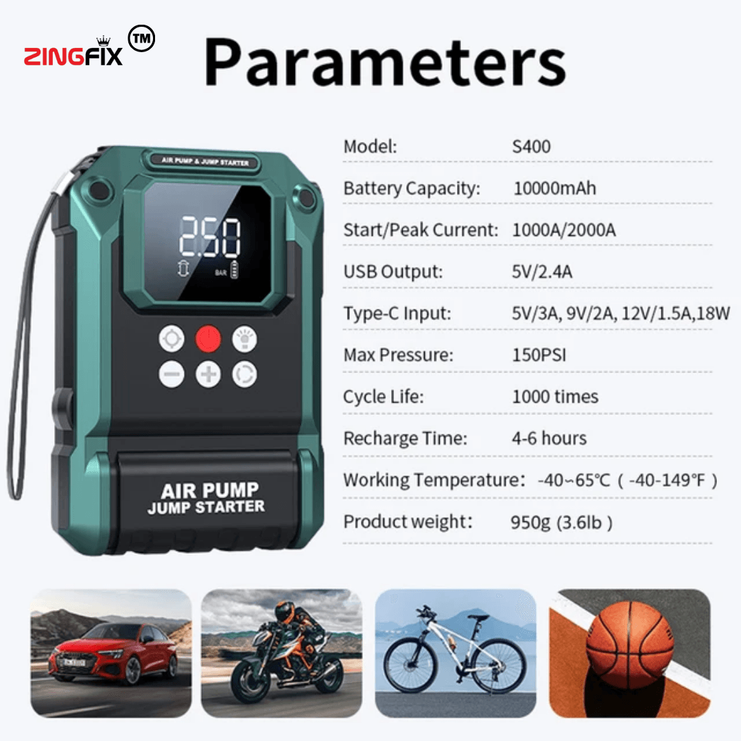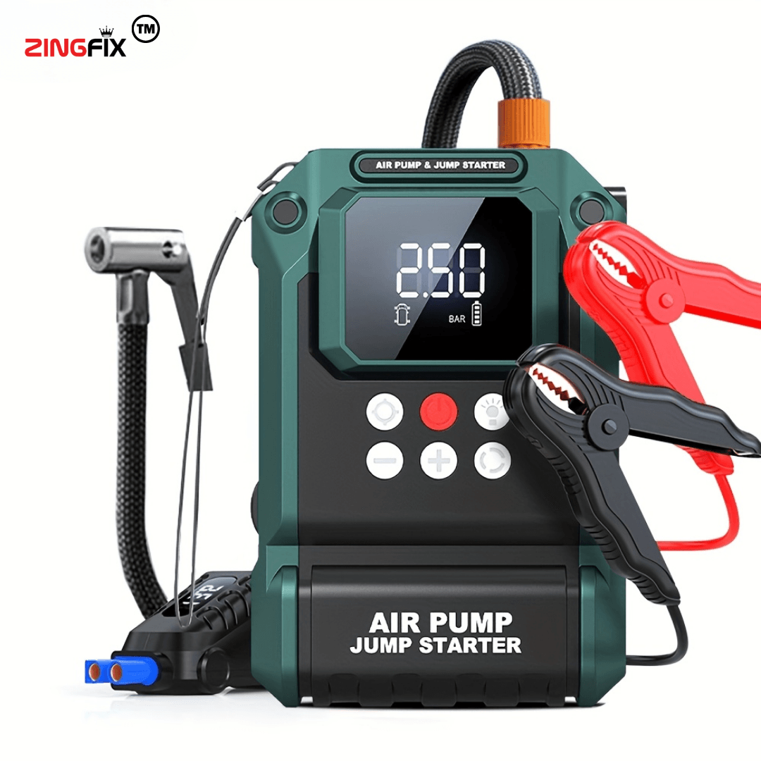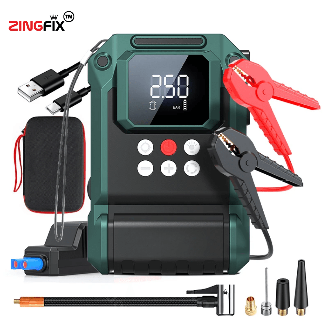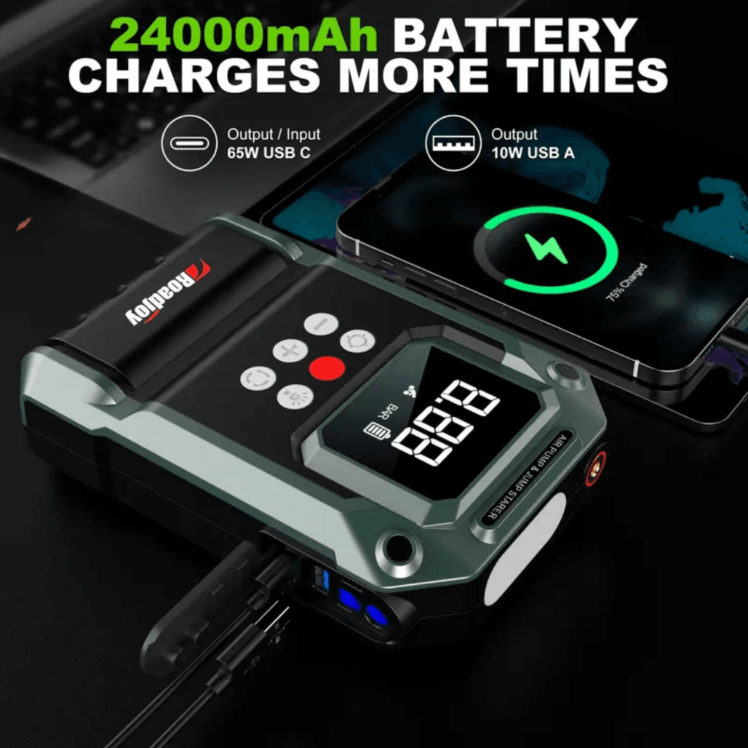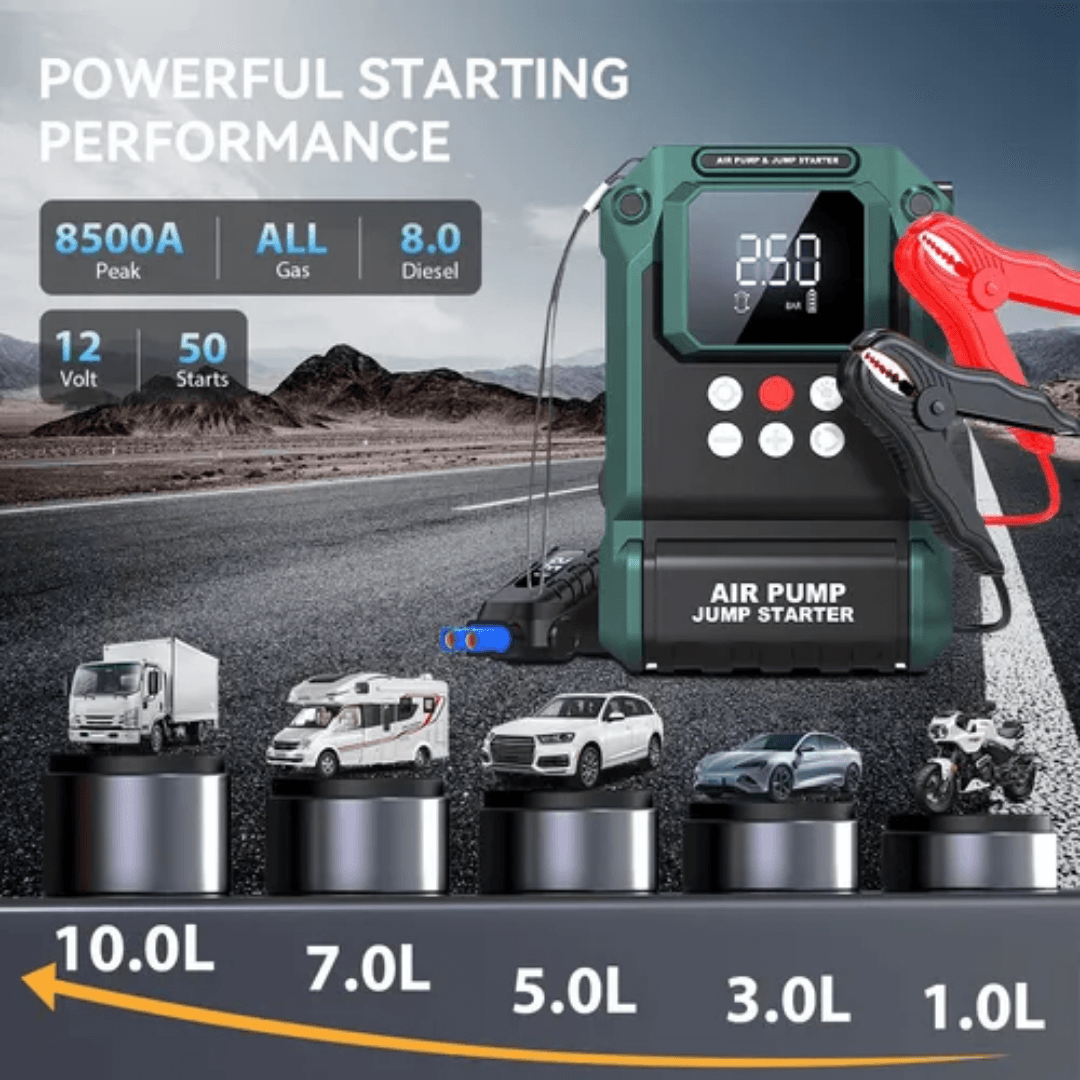 Experience unmatched performance and reliability with this Heavy-Duty 12V Car Jump Starter with Air Compressor — a powerful, all-in-one emergency device built for demanding situations. Equipped with a high-capacity 10000mAh battery, it can instantly jump-start cars, SUVs, and bikes, even in extreme conditions.