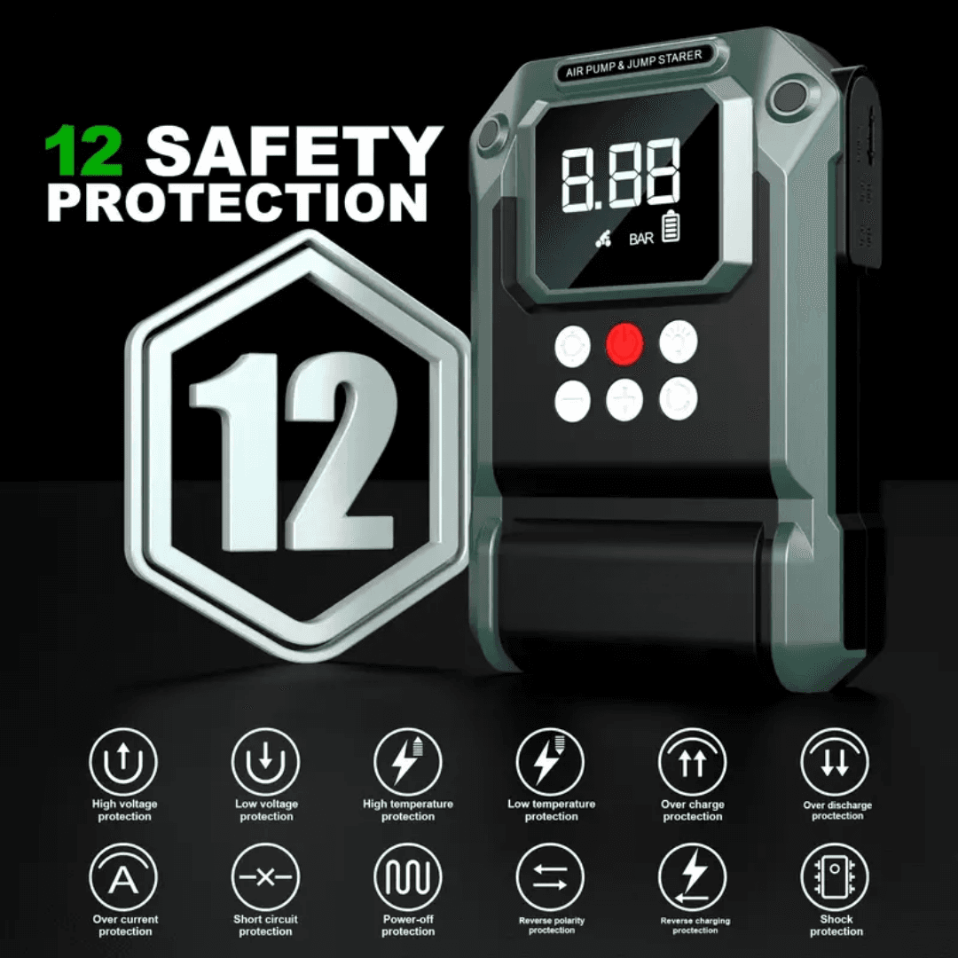 The integrated air compressor lets you quickly inflate car and bike tires, sports equipment, or inflatables on the go — no need for separate tools. Its advanced safety protection system guards against reverse polarity, overcurrent, overvoltage, and overheating, ensuring secure operation every time.