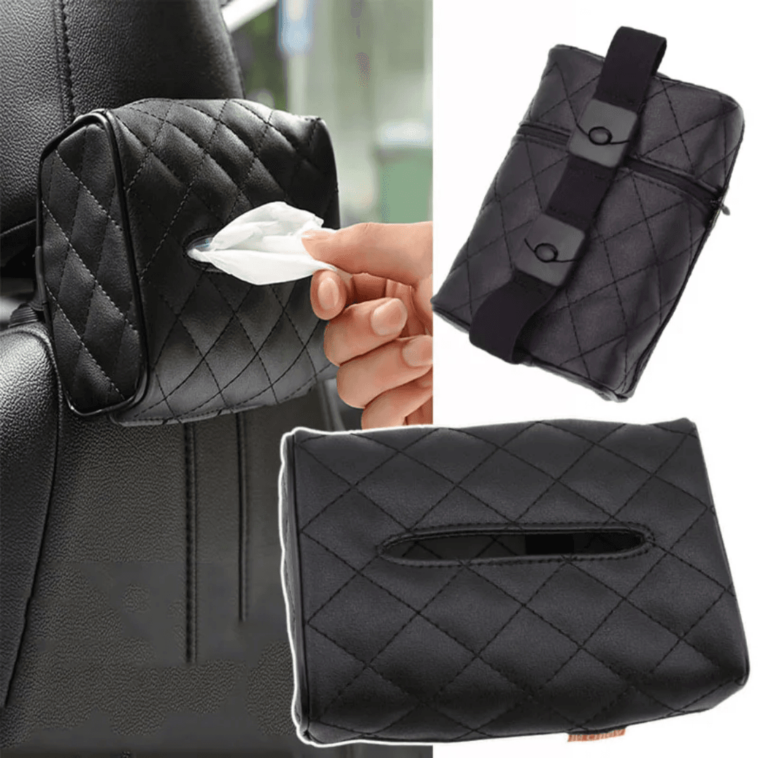 Premium Leather Car Tissue Box Holder – Sun Visor & Back Seat Mount with Strap